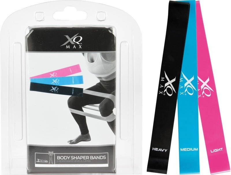 XQMAX BODY SHAPER BANDS SET OF 3 BANDS. COLOR PINK 225C 300X50X0,6MM, COLOR BLUE 2995C 300X50X0,8MM, COLOR BLACK 300X50X1MM. EACH WITH WHITE LOGO PRINT. LIGHT/MEDIUM/HEAVY RESISTANCE. MATERIAL: LATEX. INCLUDING BLACK DRAWSTRING POUCH WITH WHITE XQMAX LOGO PRINT. SET PACKED IN CLAMSHELL WITH COLORCARD AND MANUAL/ POUCH, 150X45X185MM, Double blister: 1 X pc resistance loop, Rubber, Pink, 300X50X1MM,1 X pc resistance loop, Blue, 300X50X1MM,1 X pc resistance loop, Black, 300X50X1MM / CFT 0,70,(70.000/40ft HQ)
