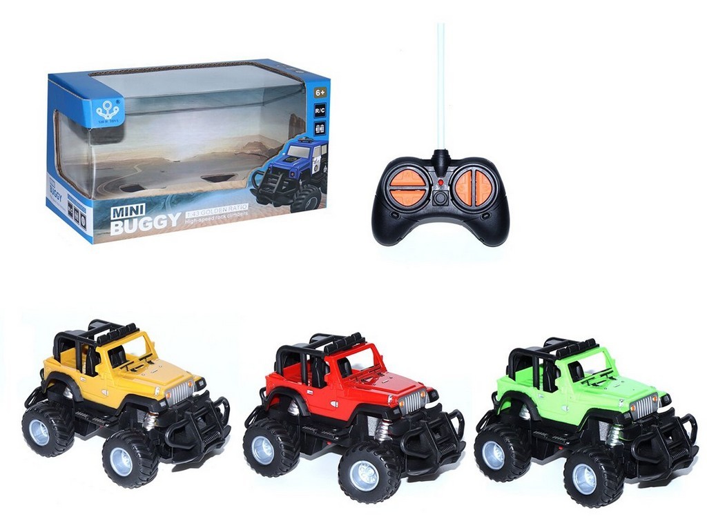 Auto jeep na dálkové ovládání v měřítku 1:43. Auto jezdí vpřed, vzad, vlevo a vpravo. Přímý směj je možné korigovat korekční páčkou na spodní číasi auta. Rozmě auta 14 cm, ovladač je vysoký 25 cm. Napájení: auto 2 x AA 1,5 V, ovladač 2 x AA 1,5 V (baterie nejsou součástí). Vhodné pro děti od 6 let. Rozměr boxu 10 x 11 x 20 cm.