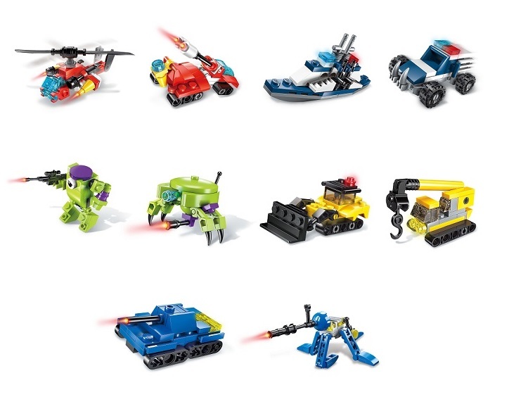 1x Sestřelovač letadel 3v1 (obsahuje 34 dílků) 1x Eskorní loď 3v1 (obsahuje 28 dílků) 1x Policejní auto "Hammer" 3v1 (obsahuje 31 dílků) 1x Robot "Troops" 3v1 (obsahuje 28 dílků) 1x Průzkumník "Beetle" 3v1 (obsahuje 30 dílků) 1x Buldozér "Swarm" 3v1 (obsahuje 30 dílků) 1x Jeřáb "Hoist" 3v1 (obsahuje 27 dílků) 1x Tank "Amphibious" 3v1 (obsahuje 36 dílků) 1x Robot "Pompom" 3v1 (obsahuje 31 dílků) Cena je za sadu 10 kusů. Je také možné zakoupit pouze 1 kus stavebnice. Stavebnice je kompatibilní s Lego, Sluban a dalšími stavebnicemi tohoto typu.