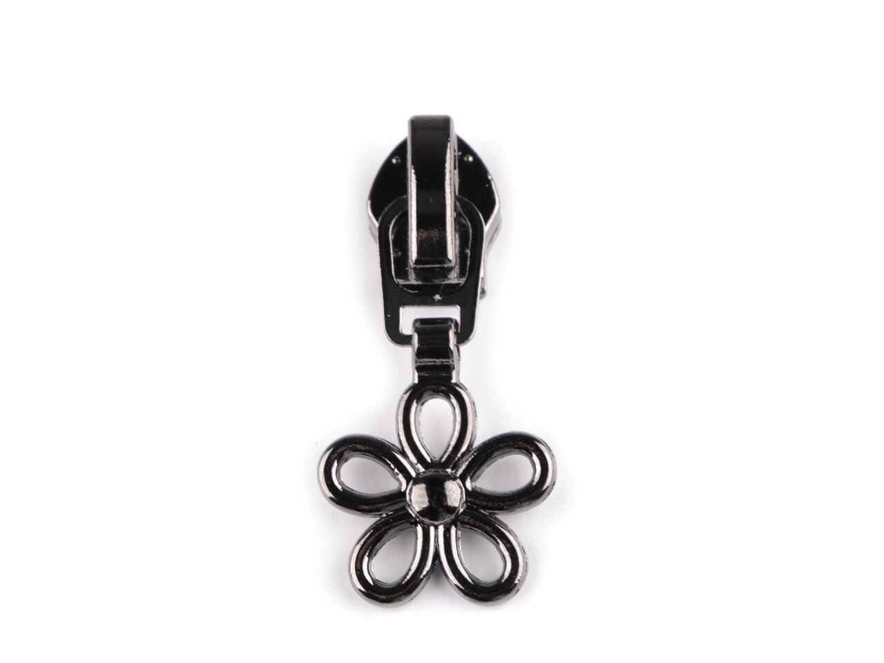 Kovový jezdec s ozdobným táhlem je určený ke spirálovým zipům 5 mm v metráži, které u nás najdete pod kódy 050714, 800963, 790304. Táhlo má tvar květu.
