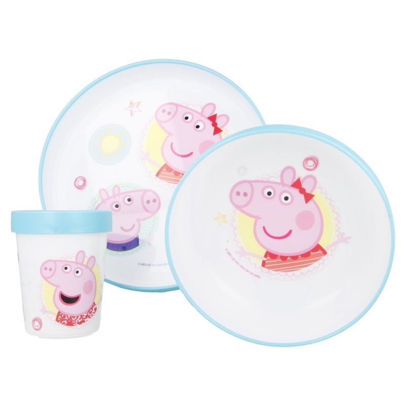 Praktická sada plastového nádobí pro děti obsahuje talíř, misku a kelímek o objemu 260 ml s motivem Prasátka Pepy. Umožní Vám pohodlnou přepravu jídla Vašeho batolete. Je vhodný do mikrovlnné trouby a plast neobsahuje BPA. Zamilují si ho děvčata i chlapci, protože je ozdoben jejich oblíbenými postavičkami.