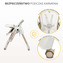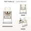 Krzesełko zostało wyposażone w 5-stopniową regulację wysokości, co umożliwia łatwe dopasowanie go do każdego stołu. Dodatkowo tacka odchyla się w 3 pozycjach względem siedziska, co znacząco zwiększa komfort dziecka podczas karmienia.