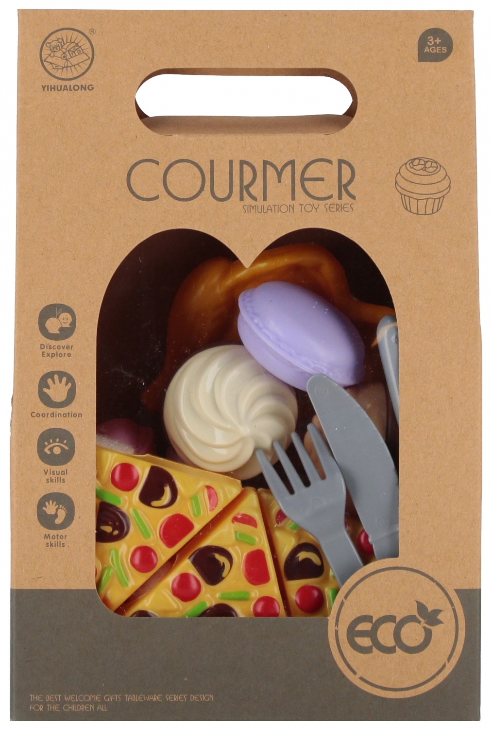 Zalety produktu: dziecko może nauczyć się podstawowych czynności domowych jakim jest np. gotowanie, poznawanie różnych kultur i obyczajów, rozwijanie pasji i kreatywności. W Zestawie Kuchennym MEGA CREATIVE znajduje się wszystko, czego potrzebuje Twoja pociecha aby zaspokoić swój głód. Może patrząc na te smakołyki również skusisz się na wspólną zabawę Zawartość zestawu: 2 x makaroniki, 2 x babeczka, 1 x Donat, 1 x lód, pudełko z lodami, pudełko z sosem, 3 x kawałki pizzy, napój, imitacja kawałka kurczaka, sztućce. Wszystkie produkty są imitacją prawdziwych. Produkty wykonane z plastiku. Wymiary/waga/baterie: wymiary produktu w opakowaniu dł. x wys. x gł. cm : 16x24x9, waga produktu bez opakowania kg : 0,12 kg, waga produktu w opakowaniu kg : 0,18 kg, nie wymaga zasilania bateriami. Zabawka przeznaczona dla dzieci w wieku: 3 . Zestaw pakowany w kartonową torebkę. W kartonie zbiorczym po 36 szt.