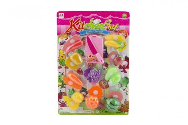 Plastová sada krájecího ovoce a zeleniny, kde najdete meloun, banán, mrkev nebo ananas, které jsou spojeny suchým zipem a úkolem dítěte je je přiloženým plastovým nožem jakoby rozkrojit, výborně si tím...