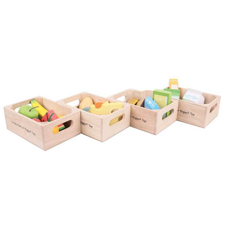 - 4 dřevěné boxy s dřevěnými potravinami podle obrázku