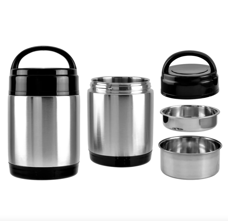 Moderní termonádoba udrží vložené jídlo dlouho teplé nebo naopak chladné. Vysoká kvalita materiálů zaručuje odolnost i bezpečné používání. Praktické široké hrdlo usnadňuje plnění i čištění, zatímco sklopná rukojeť zajišťuje pohodlné přenášení. Termoska má kapacitu 1,8 litru rozdělenou do tří misek - velké 1500 ml, střední 400 ml a malé 200 ml, které jsou vybaveny silikonovými víčky pro absolutní těsnost a hygienu.