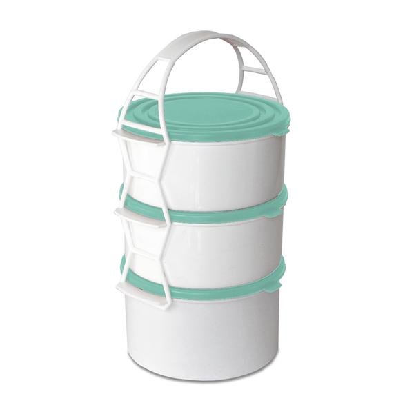 Praktické lehké třídílné provedení jídlonosiče, který slouží pro přenášení pokrmů. Jídlonosič je vhodný pro domácí použití, zvláště pro lidi, kteří doma nevaří příliš často a obědy si přinášejí z jídelen nebo restaurací. Může být použit i pro společnosti zabývající se rozvozy hotové stravy (charitativní domy, penziony, vývařovny, obecní úřady). Nádoby jídlonosiče jsou vhodné do mrazáku, mikrovlnné trouby i myčky nádobí. Objem 2 x 1,3 l a 1 x 1,7 l. Assort barev víček.