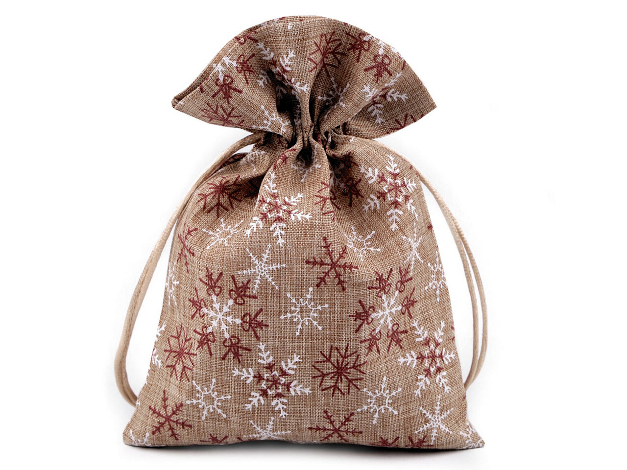 Vánoční pytlík zdobí potisk vloček. Snadno se uzavírá pomocí dvou stahovacích šňůrek. Je pevný.Můžete jej použít na zabalení menších dárků, je krásný i jako dekorace na Vánoce. číst celé