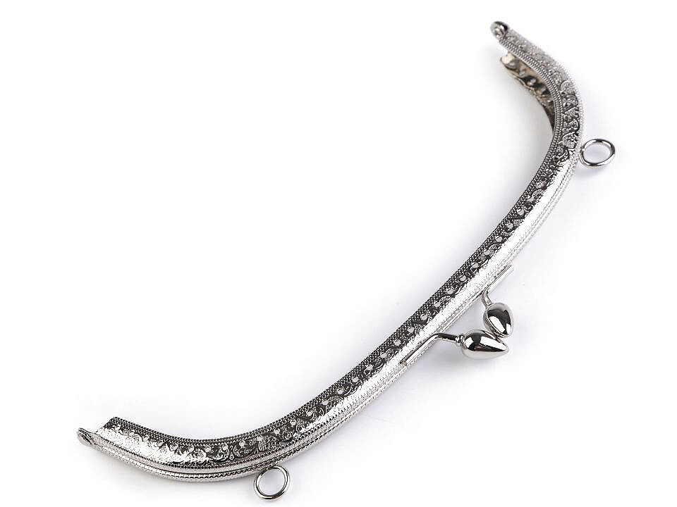 Kovový rámeček se zapínáním je určený na výrobu kabelky. Zapínání má nahoře úchyty na ucha. Rámeček je určený k našití, kdy se látka dovnitř vloží a ručně přešije přes dírky, jejichž rozpětí je 6 mm. Dírky jsou jen na vnější straně rámečku, která je delší než vnitřní, tudíž je našívání jednodušší. Tento typ zapínání využijete určitě na jakýkoliv typ kabelky, ať už společenské nebo určené ke všednímu nošení.
