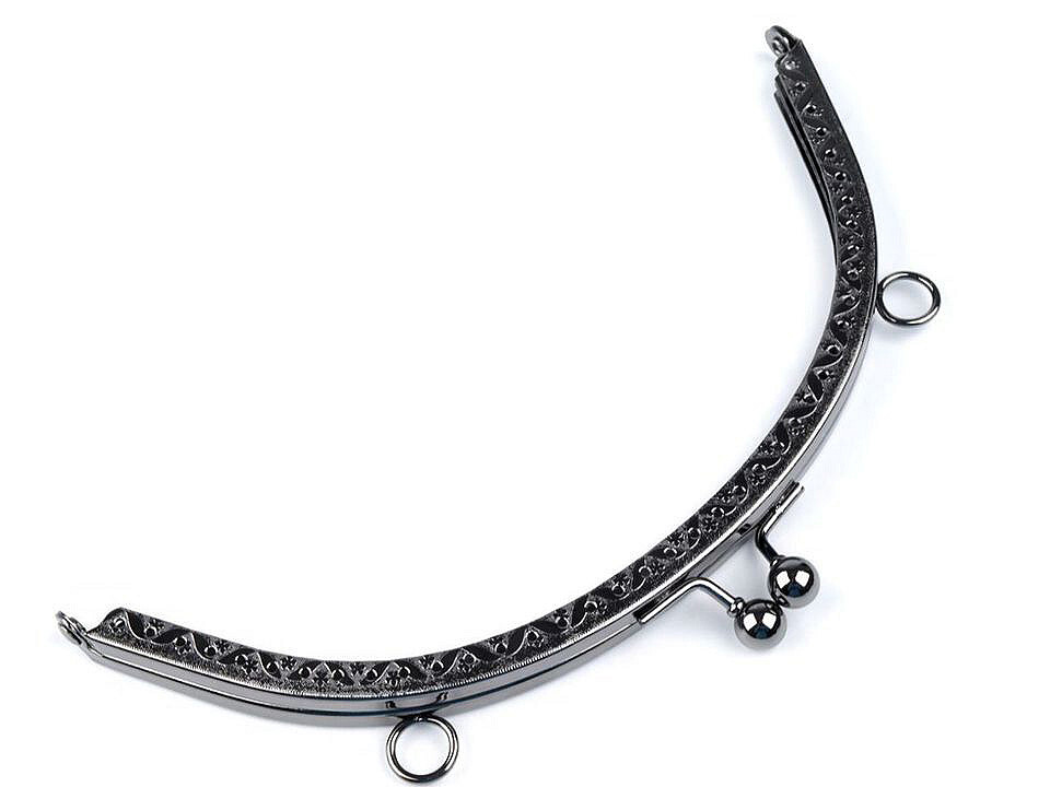 Kovový rámeček se zapínáním na výrobu kabelky. Zapínání má nahoře úchyty na ucha o průměru 1 cm. Rámeček je určený k našití, kdy se látka dovnitř vloží a ručně přešije přes dírky, jejichž rozpětí je 6 mm. Dírky jsou jen na vnější straně rámečku. Tento typ zapínání využijete určitě na jakýkoliv typ kabelky, ať už společenské nebo určené ke všednímu nošení.