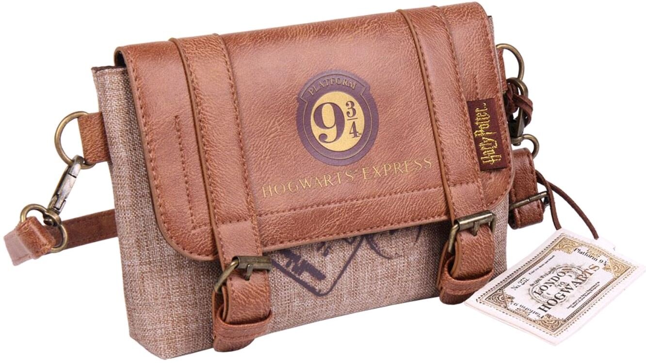 Velice atraktivní a praktická taška v hnědé barvě s přezkami a se zapínáním na cvoky. Taška se může nosit přes rameno, nebo okolo pasu. Na přední straně je vyobrazený znak kouzelného nástupiště 9 a 3/4 z filmové ságy Harry Potter.