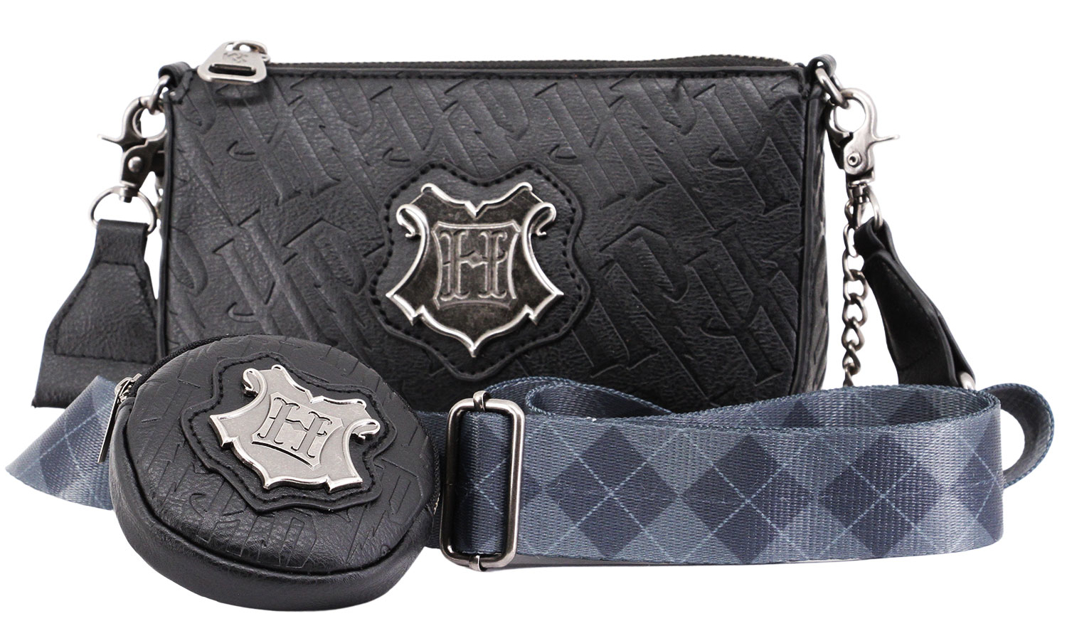 Černá dámská jednoprostorová kabelka inspirovaná znakem školy čar a kouzel v Bradavicích s vnitřní podšívku a kapsou. Celá taška má černý pevný materiál a je uzavíratelná zipem. Kabelka má možnost dvou různých popruhů - 140 cm nastavitelný ramenní popruh nebo 47 cm řetízek. Součástí je i malá kulatá peněženka na mince ve stejném designu.