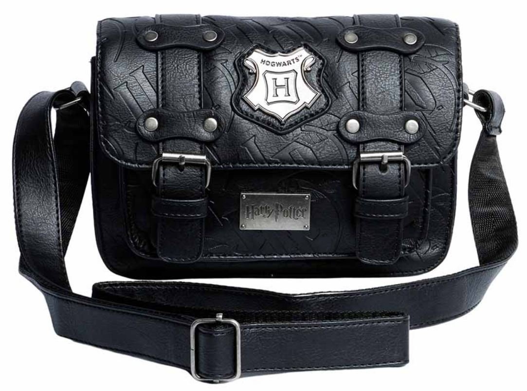 Černá dámská kabelka s popruhem přes rameno se znakem Školy čar a kouzel Bradavice.