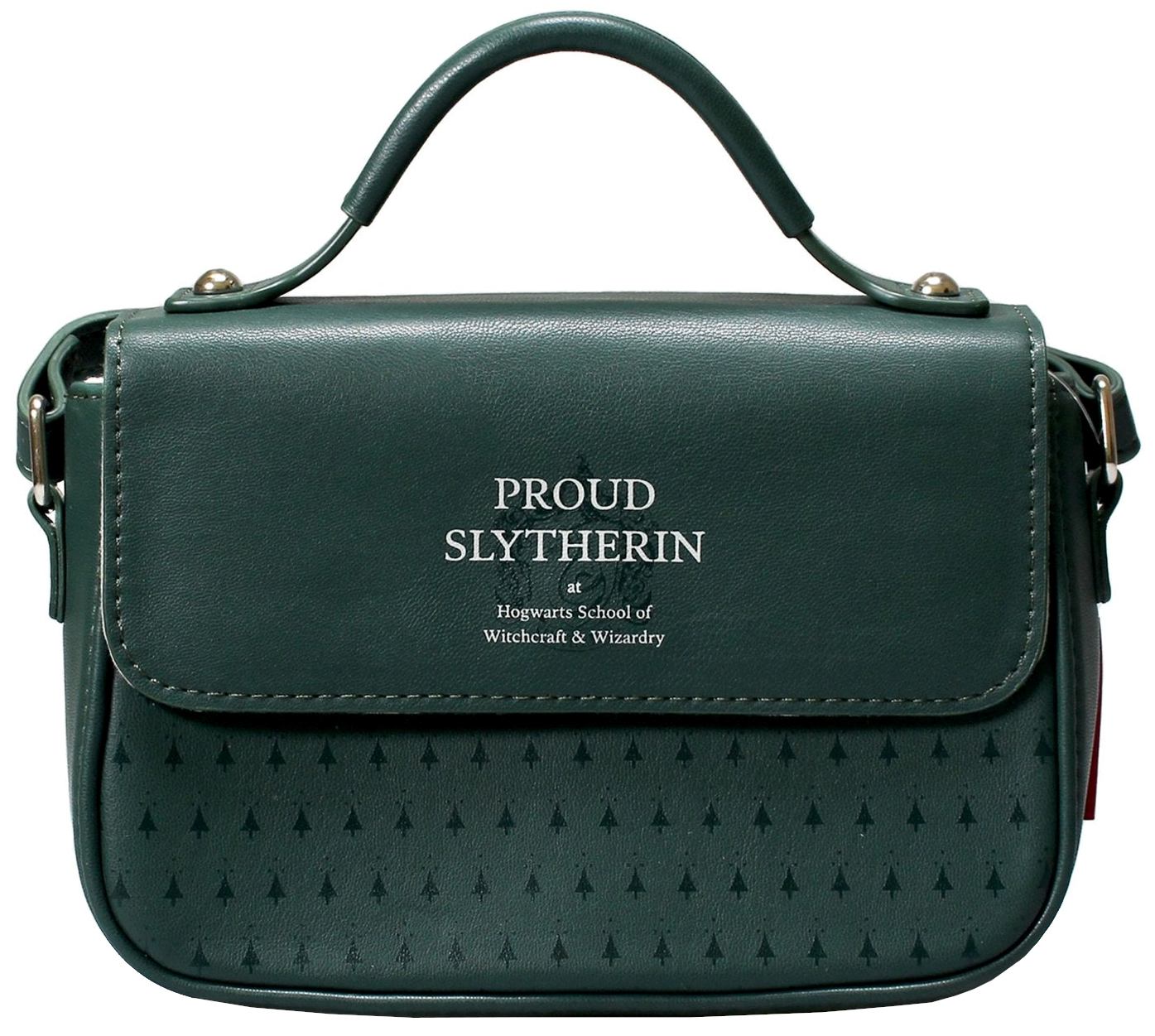 Zelená dámská kabelka s popruhem a uchem pro nošení v ruce vyvedená v motivu koleje Zmijozel.