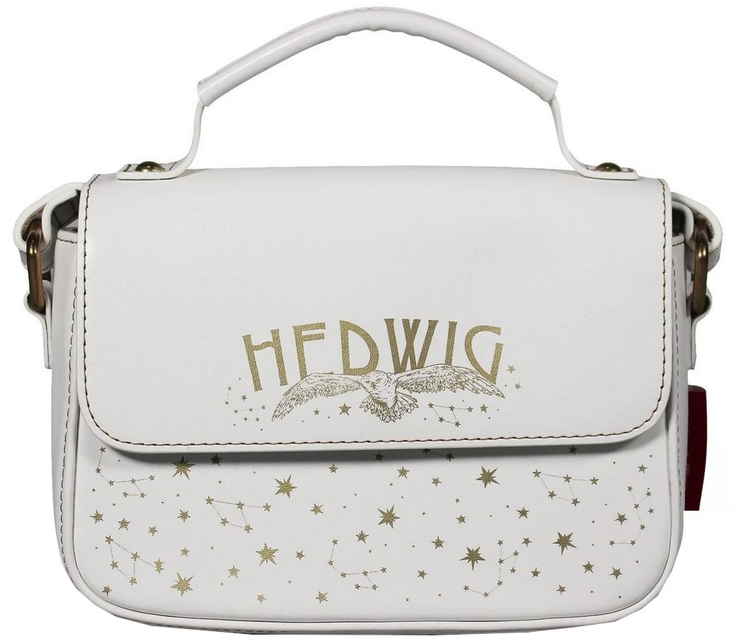 Bílá dámská kabelka se zlatou grafikou a nápisy sovy Hedviky (Hedwig). Kabelka má řetízkový popruh, který se dá odepnout, takže ji můžete nosit i za poutko, nebo v ruce. Na zadní straně kabelky je logo ságy Harry Potter. Kabelka je vhodná pro všechny fanynky a milovníky filmu.