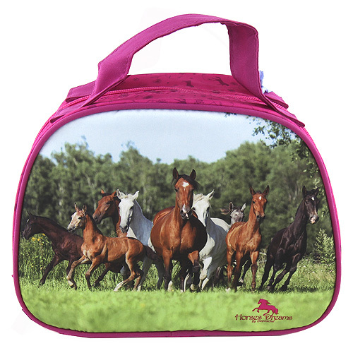Dívčí kosmetická taštička v designu Horses Dreams provedená z velmi kvalitního materiálu potěší každou milovnici koní. Je uzavíratelná na zip a obsahuje dvě průhledné kapsy též na zip, jedna z nich perfektně odděluje vnitřní prostor. Uvnitř je malé zrcátko připeněné na suchý zip. Na vnitřní stěně tašky jsou gumičky pro připevnení uschovaných flakonků. Taštička je omyvatelná a tvoří nádherný designový doplněk.Velikost: 24,5 x 9,5 x 19,5 cm, materiál: 100 % polyester.
