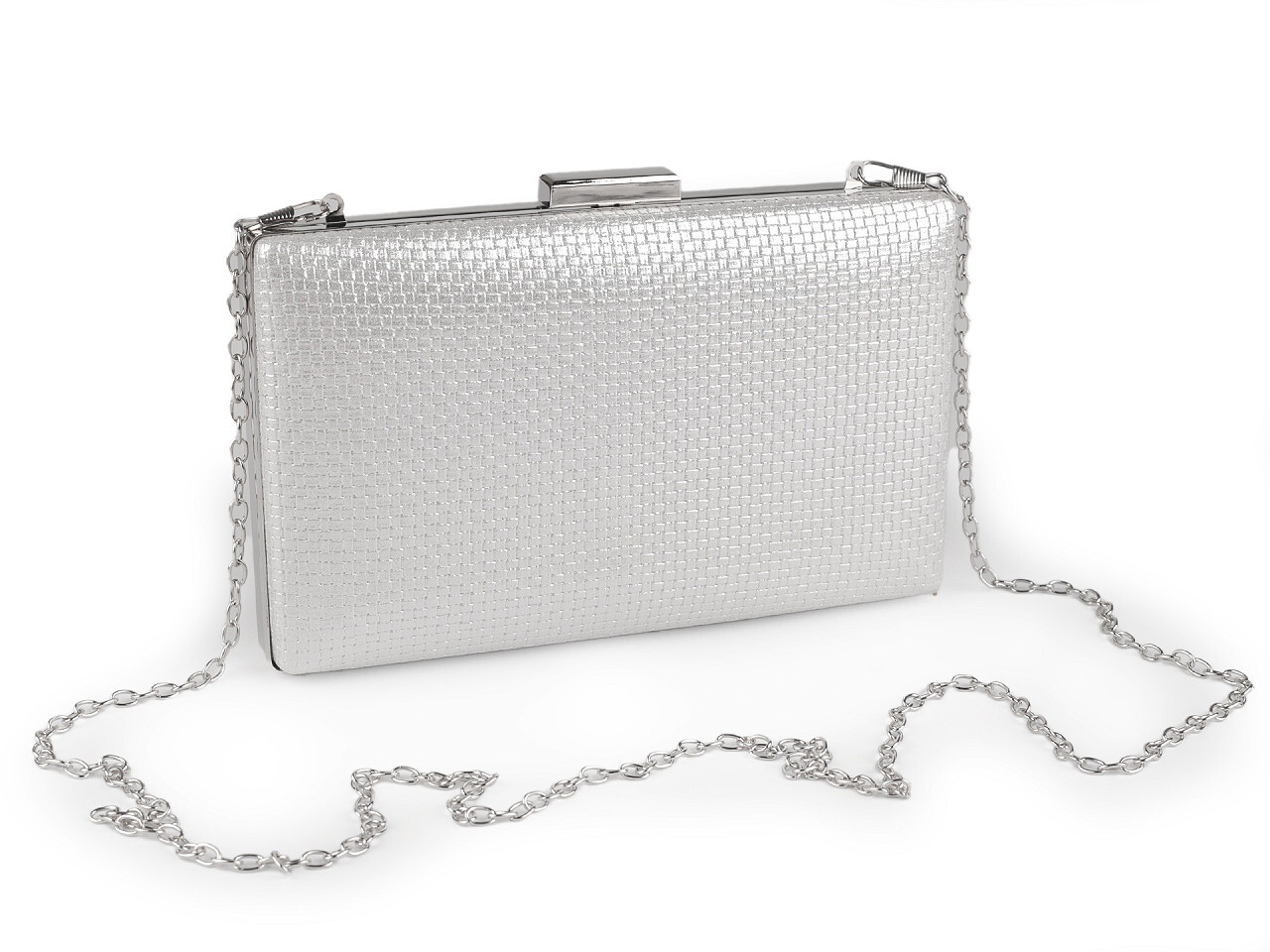 Malá společenská kabelka vyzařuje eleganci a luxus, má metalický lesk. Povrch má zajímavou kostičkovou strukturu. Zdobí ji výrazné lesklé zapínání a rámeček po celém obvodu. Kabelka je pevně vyztužená, její součástí je dlouhý odnímatelný řetízek na karabiny. Můžete ji nosit v ruce nebo jako crossbody přes rameno či do kříže.