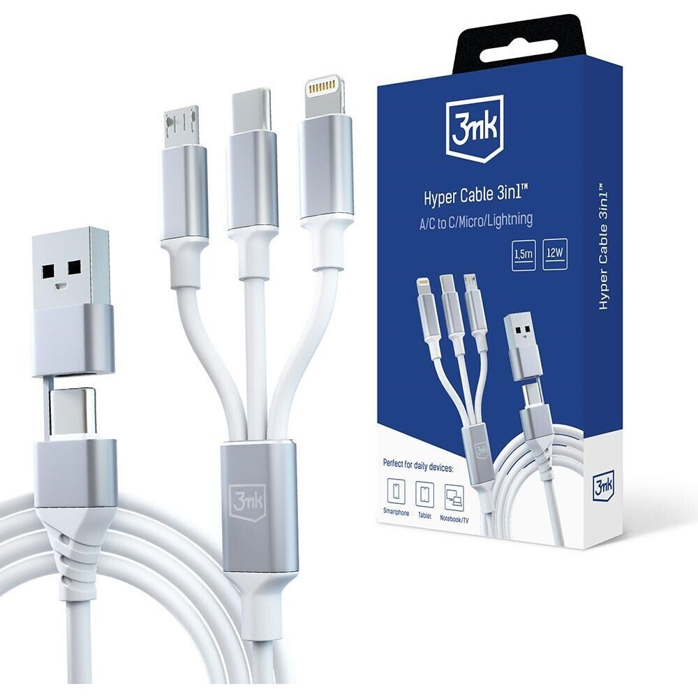 3mk Hyper Cable 3v1 nabíjecí kabel A/C to C/Micro/Lightning, 1,5m bílý