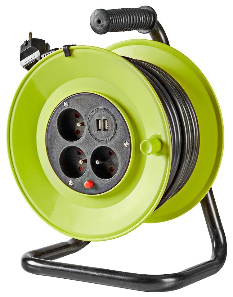 Prodlužovací napájecí kabel nabízí 3 zásuvky, 25 m dlouhý kabel a namotávací buben pro snadnou manipulaci. Je vybaven bezpečnostními dětskými záslepkami, tepelnou elektrickou pojistkou a dvěma USB porty pro nabíjení mobilních zařízení. Maximální zátěž při plném odmotání činí až 3680 W.