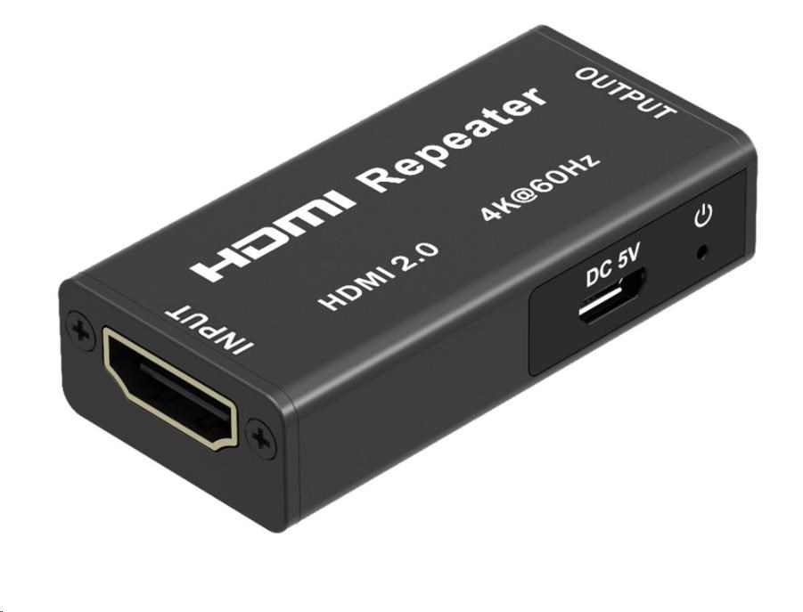 - Extender je napájen z HDMI sběrnice, repeater má přídavný konektor pro napájení, ve většině případů toto přídavné napájení není třeba zapojovat, repeater je napájen z HDMI