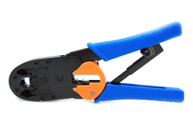 Univerzální krimpovací kleště pro RJ11,RJ12,RJ14,RJ45 konektory s funkcí stříhání, stahování a krimpování konektorů. Včetně ráčny pro uzavření kleští.