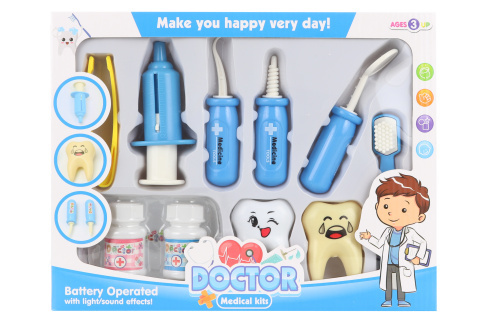 Sada zubař ubsahuje dva zuby, kartáček, zrcátko, vrtačku, pinzetu, tácek a další doplňky. Rozměr balení cca 30 x 24 x 5,5 cm. Věk 3+