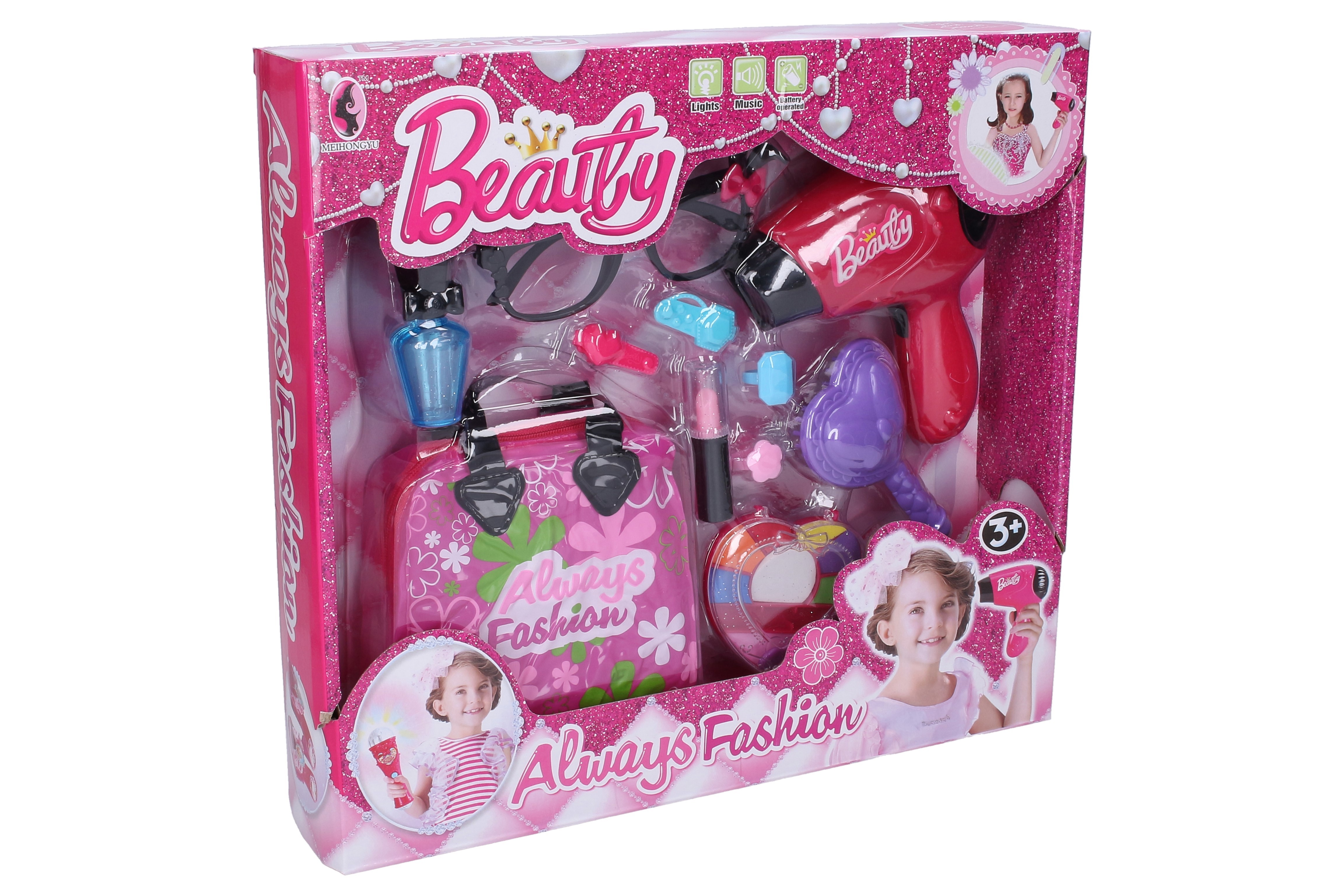 Kosmetický set s fénem. Balení obsahuje sponky, prsteny, rtěnku, makeup, voňavku, zrcátko, kabelku, brýle, a fén se zvukovými efekty. Fén - 1xAA baterie, není součástí. číst celé