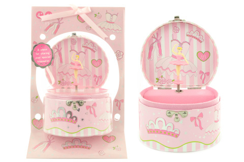 Hrací skříňka šperkovnice s baletkou. Uvnitř špekovnice je zrcátko a baletka, která po natažení klíčku tančí a hraje. Velikost cca 12,5 x 8 x 11 cm. Rozměry balení cca 18,5 x 26,5 x 11,5 cm. Věk 4+