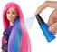 Vezmi si do parády vlasy panenky Barbie® a změň jejich barvu pomocí vody. Vyber si buď pastelové odstíny, nebo velmi výrazné, zářivější barvy! Ozvláštni účes ještě více s dalšími pěti vlasovými doplňky, které zahrnují gumičky do vlasů, sponky a hřeben. Panenka Barbie® se oblékla do tmavě modrých šatů s pestrobarevným potiskem, který doplnila stříbrným náhrdelníkem a stříbrnými střevíčky na platformě a je připravena na stylovou zábavu a všechny příběhy, které si pro ni připravíš. Vyzkoušej jeden účes, poté ho smyj a vyzkoušej další.