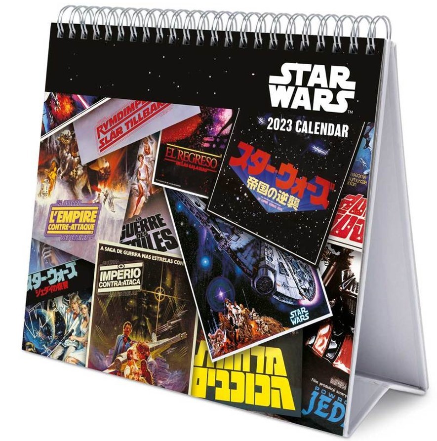 Oficiální stolní kalendář na rok 2023 z katalogu produktů s logem a grafikou filmové ságy Star Wars.