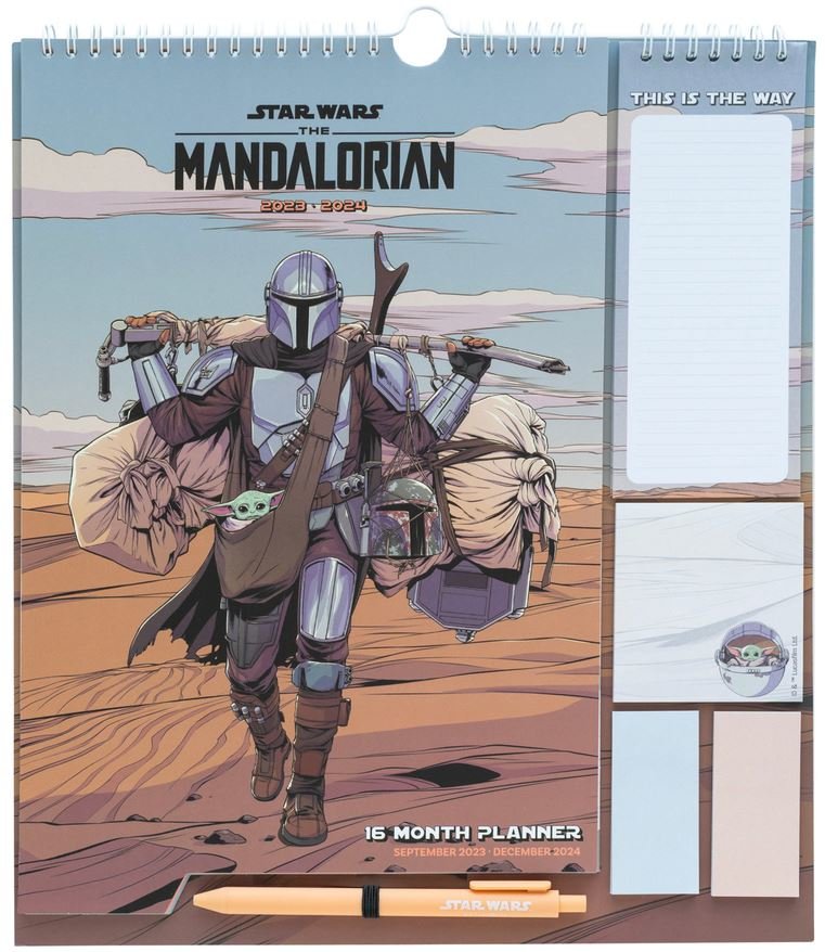 Oficiální produkt - nástěnný plánovací kalendář a organizér 2023/2024 z katalogu zboží s grafikou a licencí populární filmové ságy The Mandalorian.