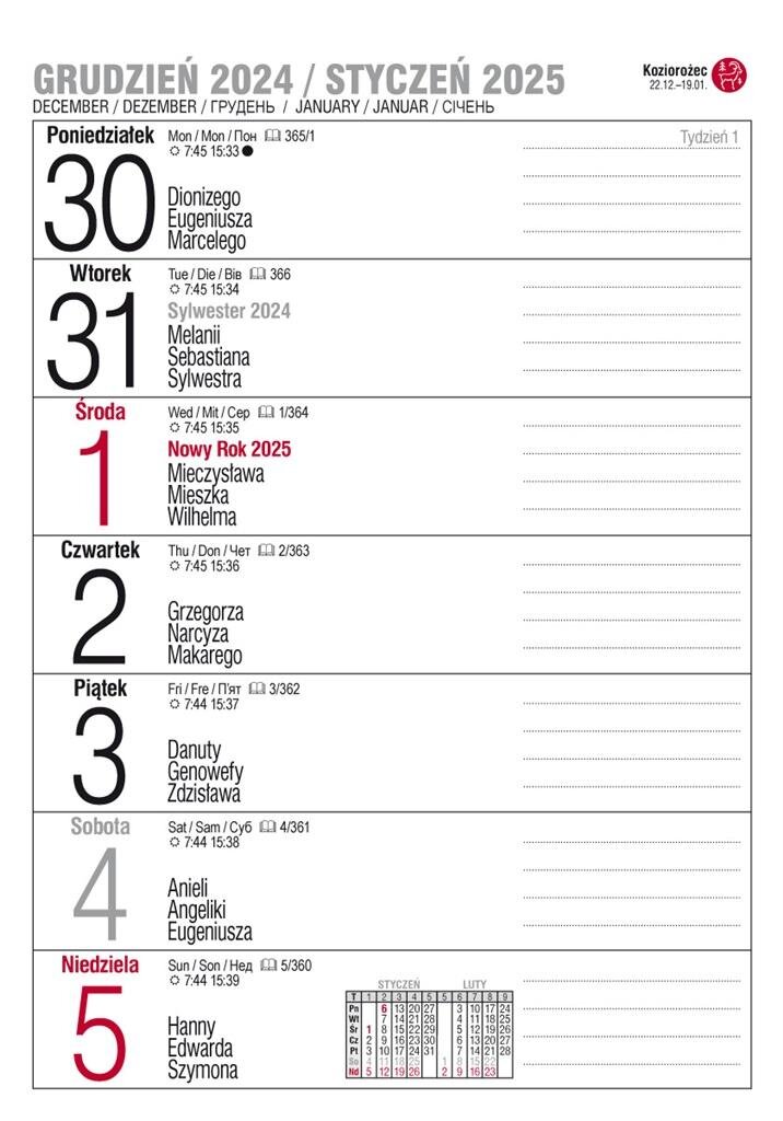Kalendarz Biurkowy A5 TYGODNIOWY PIONOWY. Oprawa czarna spirala na GRUBEJ podstawie kartonowej. Format 145/210mm. Papier offsetowy, okładka papier kredowy. 54 strony (układ tygodniowy ) + okładka. Mix wzorów, pakowany po 8szt. Kalendarz zawiera imieniny, nazwy świąt, numeracje tygodni, znaki zodiaku, wschody i zachody słońca. Dodatkowo nazwy miesiąca i dni tygodnia w języku Angielskim i Niemieckim.