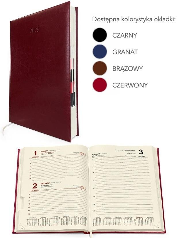 Zaprezentuj swój profesjonalizm z naszym klasycznym, a zarazem nowoczesnym Kalendarzem Książkowym A4 Dziennym na 2025 rok. Ten wyjątkowy kalendarz został zaprojektowany z myślą o tych, którzy cenią sobie pragmatyzm i minimalizm, jednocześnie nie rezygnując ze stylu. Jego prosta, ale elegancka estetyka idealnie komponuje się z każdym środowiskiem pracy i stylem życia. Kalendarz ma 352 strony i twardą, skóropodobną okładkę, która chroni wnętrze przed zniszczeniem, zapewniając jednocześnie elegancki wygląd. Układ środka jest niezwykle funkcjonalny - każdy dzień ma swoją stronę, co ułatwia organizację i planowanie. Wewnątrz kalendarza znajduje się tasiemka do oznaczania stron, co pozwala na szybkie odnajdywanie ważnych notatek lub ostatnio zapisanej strony. Druk w dwóch kolorach na papierze o gramaturze 60 g/m w kolorze ecru sprawia, że kalendarz jest czytelny i estetyczny. Kalendarium w języku polskim i angielskim zawiera numerację dni i tygodni oraz podwójne imieniny. Dodatkowe strony na notatki, telefony kierunkowe, skorowidz alfabetyczny oraz daty imienin i świąt zwiększają jego funkcjonalność. Przejrzysty układ i wystarczająca przestrzeń na notatki umożliwiają swobodne planowanie każdego dnia, co czyni nasz kalendarz idealnym narzędziem dla każdego, kto ceni sobie porządek i styl. Zaprezentuj swój profesjonalizm z naszym klasycznym, a zarazem nowoczesnym Kalendarzem Książkowym A4 Dziennym na 2025 rok. Ten wyjątkowy kalendarz został zaprojektowany z myślą o tych, którzy cenią sobie pragmatyzm i minimalizm, jednocześnie nie rezygnując ze stylu. Jego prosta, ale elegancka estetyka idealnie komponuje się z każdym środowiskiem pracy i stylem życia. Kalendarz ma 352 strony i twardą, skóropodobną okładkę, która chroni wnętrze przed zniszczeniem, zapewniając jednocześnie elegancki wygląd. Układ środka jest niezwykle funkcjonalny - każdy dzień ma swoją stronę, co ułatwia organizację i planowanie. Wewnątrz kalendarza znajduje się tasiemka do oznaczania stron, co pozwala na szybkie odnajdywanie ważnych notatek lub ostatnio zapisanej strony. Druk w dwóch kolorach na papierze o gramaturze 60 g/m w kolorze ecru sprawia, że kalendarz jest czytelny i estetyczny. Kalendarium w języku polskim i angielskim zawiera numerację dni i tygodni oraz podwójne imieniny. Dodatkowe strony na notatki, telefony kierunkowe, skorowidz alfabetyczny oraz daty imienin i świąt zwiększają jego funkcjonalność. Przejrzysty układ i wystarczająca przestrzeń na notatki umożliwiają swobodne planowanie każdego dnia, co czyni nasz kalendarz idealnym narzędziem dla każdego, kto ceni sobie porządek i styl.