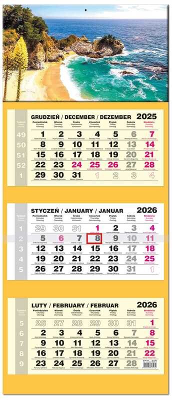 Kalendarz ścienny, trójdzielny LUX kalendarz ścienny, trójdzielny z główką wypukłą !!! wymiary: 33,5 x 76,5 cm układ miesięczny z poprzednim i następnym miesiącem posiada numerację tygodni, imieniny nazwy miesięcy i dni tygodnia w języku polskim, angielskim, niemieckim kalendaria w różnych kolorach do zrywania opaska z okienkiem doskonały do biura i dla firm
