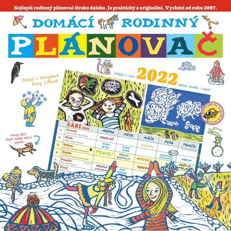 Zažijte v roce 2022 duhu, parno i vichřici. Proč by ne? Linorytové příběhy Petry Cífkové se totiž hodí do jakkéhokoli počasí. Sami moc dobře víte, že rodinné plánování často připomíná pořádně nepřehlednou bouřku, s námi se Vám to ale nestane. Každý má totiž v plánovači vlastní prostor, takže rodinný chaos se přežene dřív než letní bouřka. Vychází již 16. rok.
