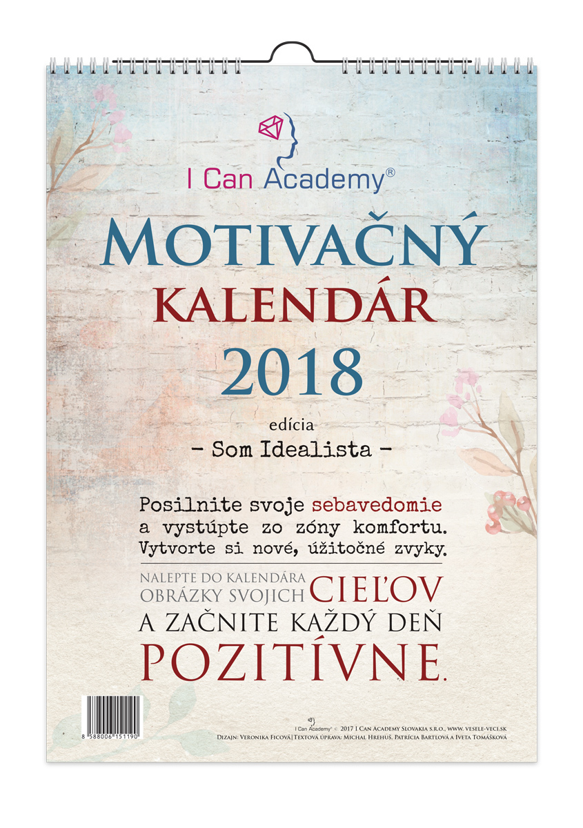 Prostredie, v ktorom žijeme a pracujeme, vplýva až z 30 % na náš celkový pocit šťastia. Veríme preto, že keď si vytvoríme domov alebo kanceláriu plnú pozitívnych podnetov, môže sa to pozitívne odraziť na našom šťastí, úspechu, vzťahoch, aj zdraví. Motivačný kalendár 2018 je jeden zo spôsobov, ako dodať vášmu osobnému priestoru pozitívne myšlienky, ktoré vás budú podporovať každý deň počas celého roka. *Starostlivo vybrané citáty budú na vás pozitívne vplývať vždy, keď im venujete pozornosť. *Kalendár vám pomôže vytvoriť nové prospešné zvyky. *Priestor pre váš cieľ mesiaca spolu s fotografiou vám pomôžu udržať zameranie na to, čo je teraz pre vás dôležité - či už sú to veľké ciele alebo rovnováha v živote. *Výzva mesiaca vám umožnia zaviesť citáty do praxe a vyjsť zo zóny komfortu a budovať tak svoje sebavedomie. Motivačný kalendár 2018 sme tento rok spravili v edícii Som Idealista, takže sa môžete tešiť aj na 6 výnimočných myšlienok z tohto úžasného projektu. Čo v kalendári nájdete: *Každý mesiac nové citáty usporiadané tak, aby spolu dávali ešte väčší zmysel ako samotné. *Miesto na sledovanie vašich nových prospešných zvykov. *Miesto, kde si napíšete cieľ na každý mesiac. *Priestor na obrázok vášho cieľa. *Kalendár menín. *Výzvy mesiaca, ktoré vám pomôžu zaviesť citáty do praxe a budovať sebavedomie. *6 strán v edícii Som Idealista