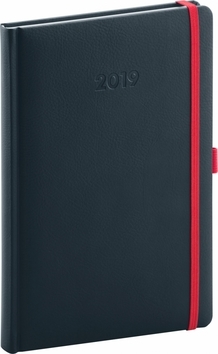 Luxusní denní diář Luzern 2019 s modrým povrchem, do kterého lze snadno razit. Je opatřený poutkem na tužku a elastickou červenou gumičkou, sloužící k pevnému uzavření.