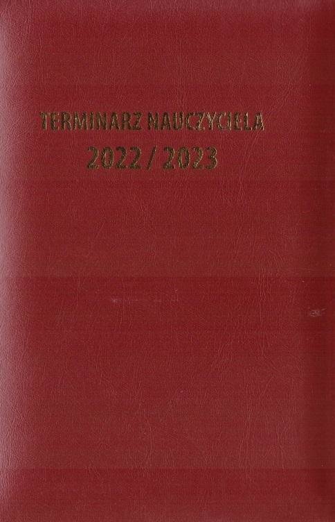OKŁADKA - miękka, skóropodobna z gąbką iobszyciem, złocenie "Terminarz Nauczyciela 2022/2023"BLOK - 140x205mm, 360 str.,papier biały 64g/m2, druk 2 kolory, tasiemka, kolorowa mapaPolski oraz Europy na wyklejkach, blok kalendarza szyty nićmi, kapitałka,perforowane narożnikiKolory:...