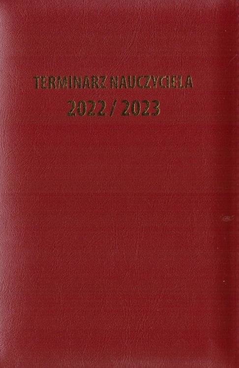 OKŁADKA - miękka, skóropodobna z gąbką i obszyciem, złocenie rokui napis "Terminarz Nauczyciela 2022/2023"BLOK - 140x205 mm, 140str., 64g/m2, biały papier, druk 2 kolory, tasiemka, kolorowa mapa Polskioraz Europy na wyklejkach, blok kalendarza szyty nićmi, kapitałka,perforacja...