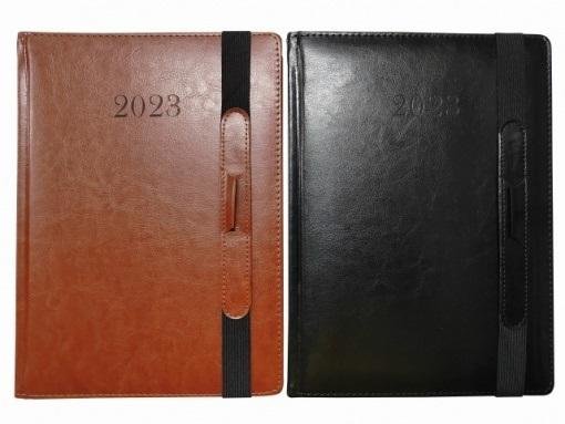 OKŁADKA: skóropodobna Nebraska z obszyciem, z gabką 3mm, tłoczenie roku, gumka 2cm z uchwytem na długopis