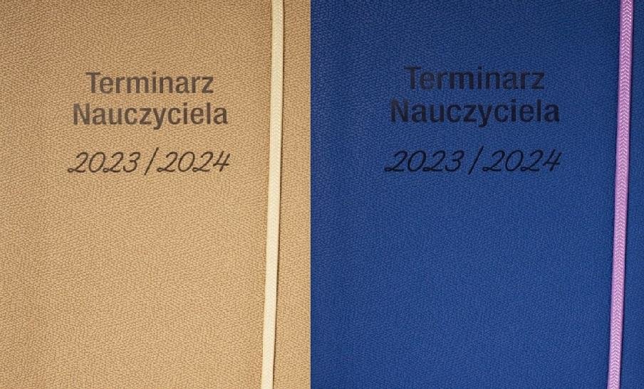 OKŁADKA - miękka, thermo PU z obszyciem i tłoczeniem "Kalendarz nauczyciela 2023/2024", gumka 6mm i elastyczny uchwyt na długopis, kieszonka na tylnej wklejce