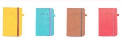 blok: 90x140 mm, 128 stron, papier kremowy 64g/m2, druk 2 kolory, kolorowe brzegi kartek, tasiemka, blok kalendarza szyty nićmi, zaokrąglone rogi