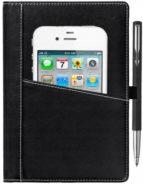KALENDARZ 2024 DZIENNY A5 PRAKTYCZNY PRAKTYCZNA KIESZONKA na TELEFON, NOTATKI, DOKUMENTY, itp. Okładka z ekoskóry Tłoczenie roku Kolorowa zakładka Wymiary: 212 x 148 mm, format A5 Układ: dzień na stronie (sobota z niedzielą są na jednej stronie) Ilość stron: 324 strony Kalendarium: 3 języczne (PL, GB, D), imieniny i święta, fazy księżyca, wschody i zachody słońca, Zodiak, na dole kalendarium plan całego roku Kolorowa Mapa Polski, krótka część informacyjna