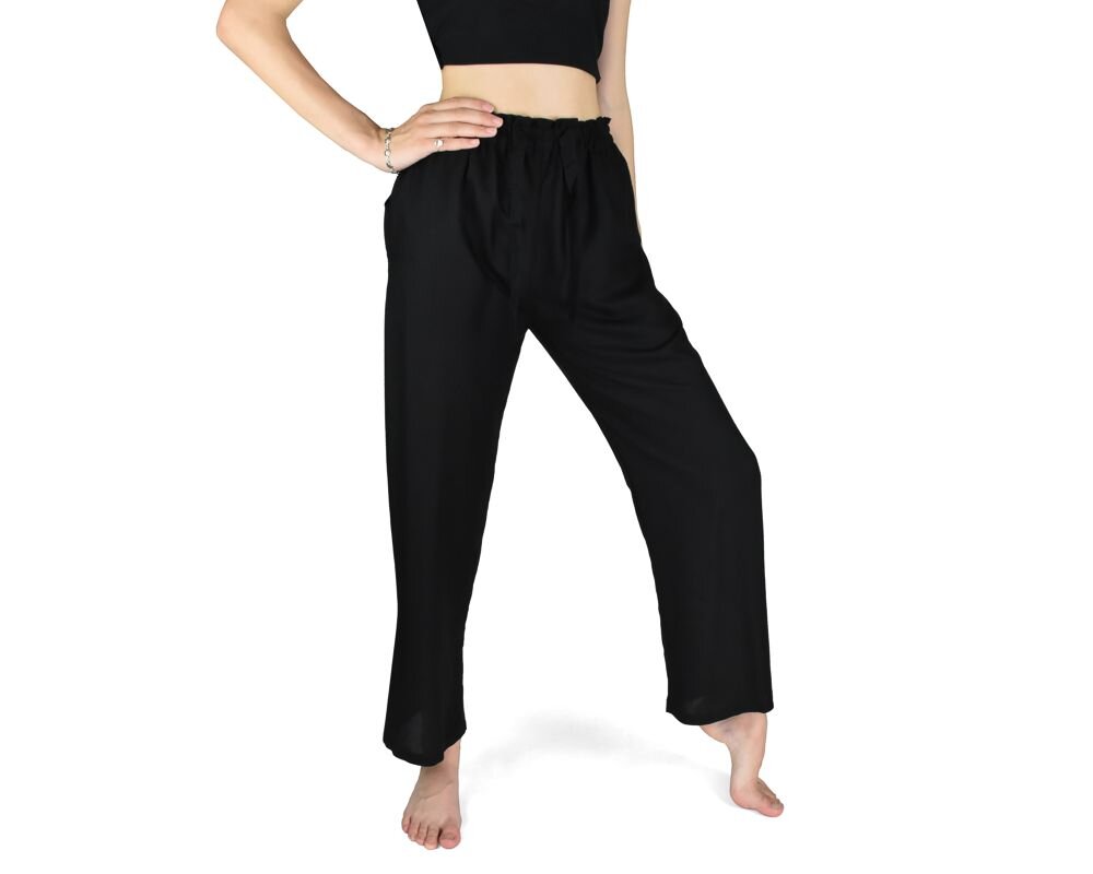 Popis: elastický pas, přišité pásky v pase na mírné utažení, dvě kapsy na bocích, klasický sed, bez gumiček na koncích nohavic. Kalhoty jsou z velmi příjemného materiálu. 100% viskóza