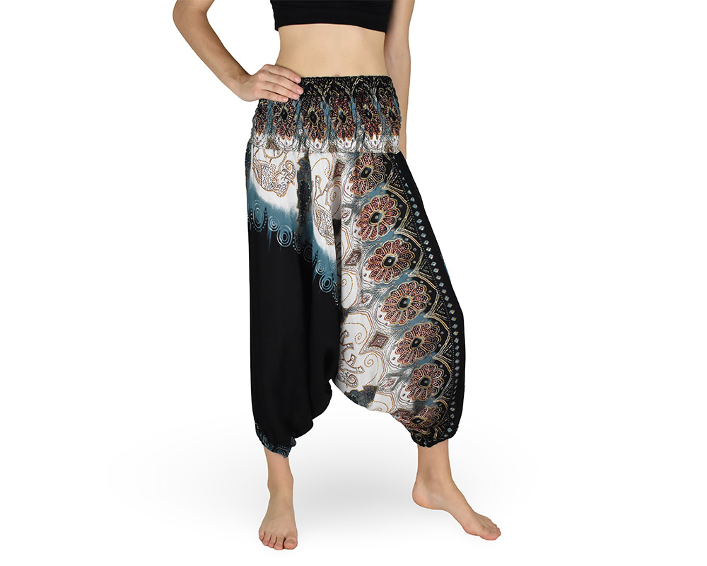 Harémové kalhoty aladin NATSU, sloni s květy, černá, bez šňůrky, květy v pase