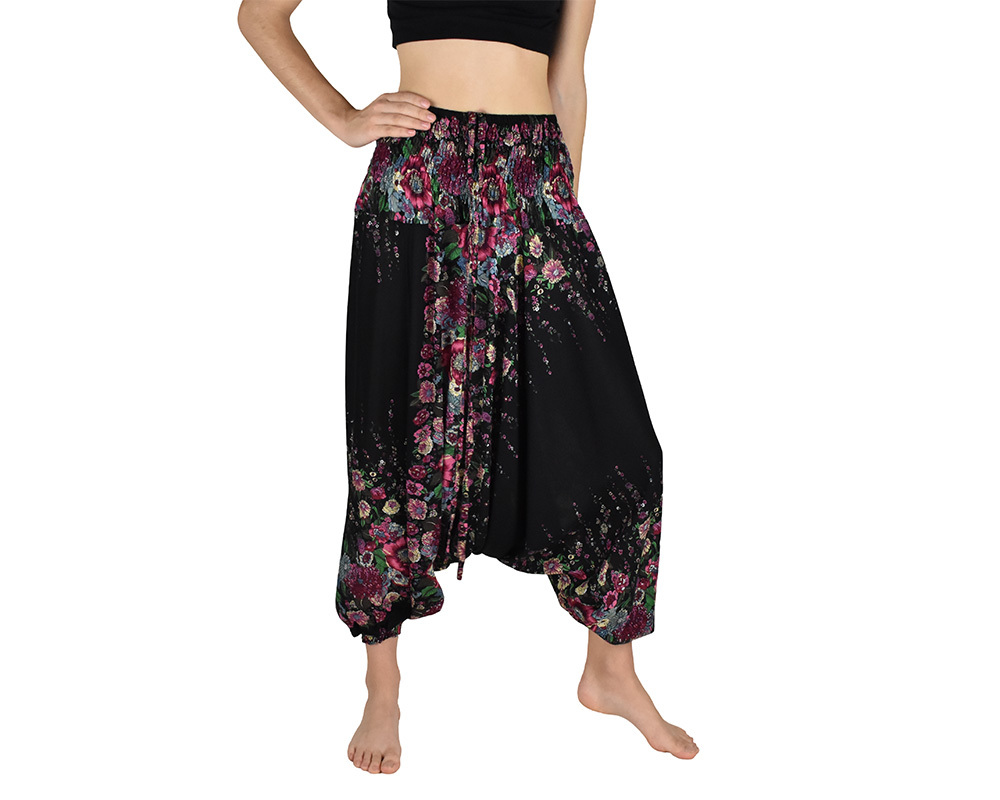 Harémové kalhoty aladin NATSU, květiny, černá, se šňůrkou, velké květy v pase