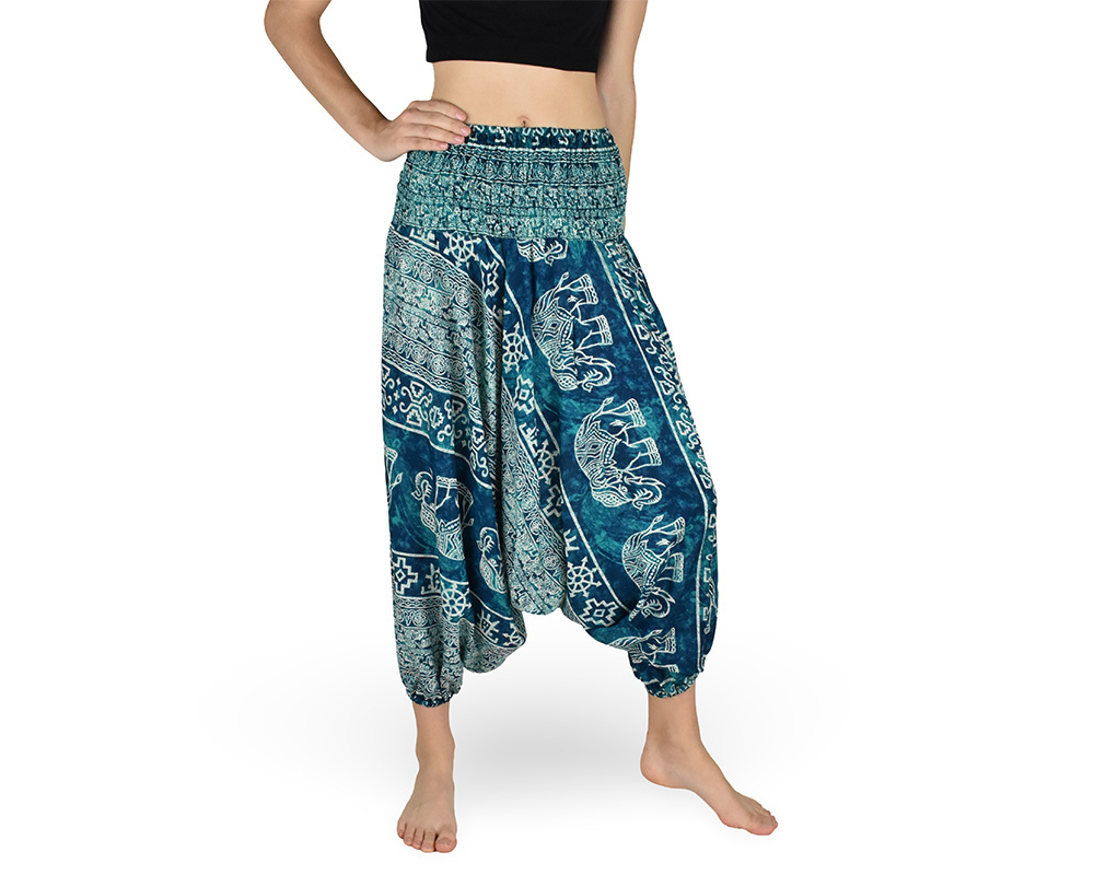 Harémové kalhoty aladin NATSU, sloni, kormidlo, tyrkysová, bez šňůrky, ornament v pase