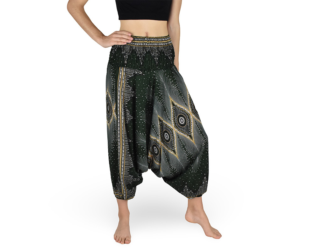 Trendy turecké (harémové) kalhoty, vícebarevné, velmi slušivé a pohodlné.Popis: elastický pas se žabkováním, gumička na konci nohavic, snížený sed, široké nohavice, možnost úvazu kolem krku pomocí šňůrky jako kalhotový overal.