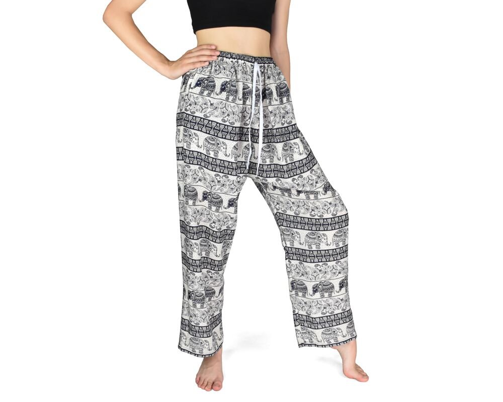Velmi slušivé a pohodlné kalhoty v jednobarevném provedení se sloním potiskem.