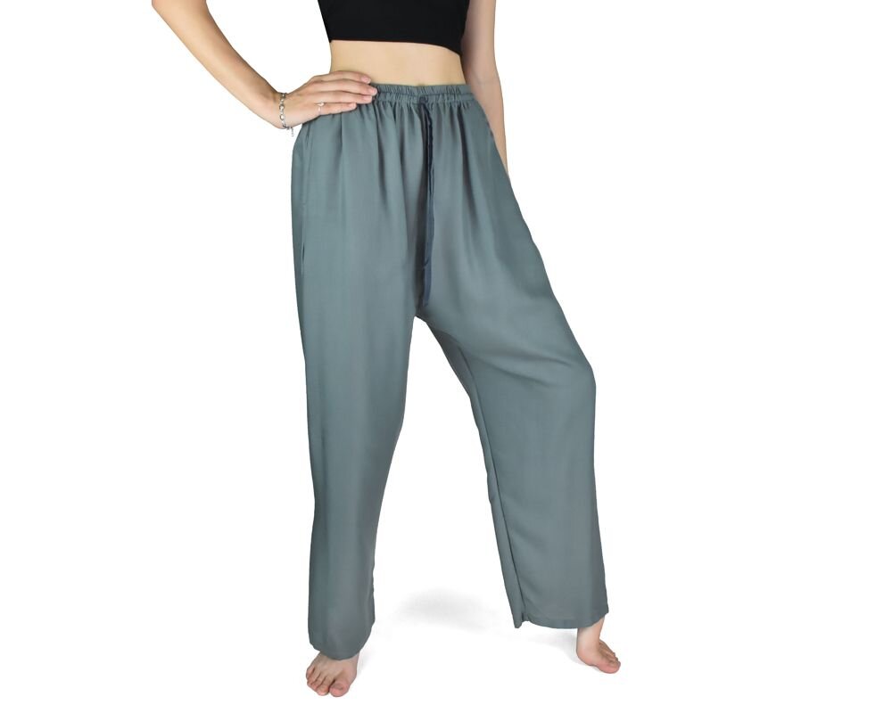 Popis: elastický pas, stahovací šňurka v pase, dvě kapsy na bocích, klasický sed, bez gumiček na koncích nohavic. Kalhoty jsou z velmi příjemného materiálu. 100% viskóza